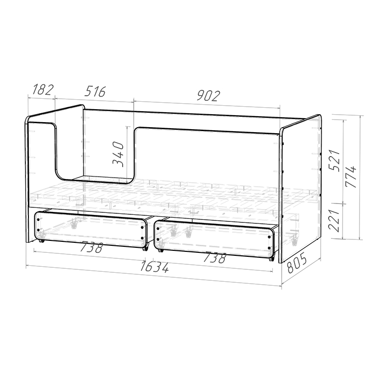 Безопасность является ключевым аспектом детской кровати "Легенда K202.02". Высокие безопасные борта высотой 521 мм обеспечивают надежную защиту от падений во сне, а также отсутствие острых углов и мягкий противоударный кант увеличивают безопасность использования кровати.