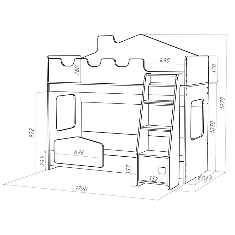 Лестница с дверью обеспечивает удобный и безопасный подъём на второй ярус. На нижнем ярусе установлен безопасный бортик, который защищает от падений во сне. Боковые стенки со световыми окнами создают уютную атмосферу и позволяют наблюдать за звёздным небом прямо с кровати.